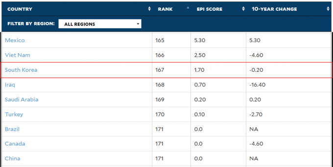 1일(현지시간) 미국 예일대 환경법·정책센터와 컬럼비아대 국제지구과학정보센터는 이같은 내용을 담은 '환경성과지수'(Environmental Performance Index·EPI) 보고서를 발간했다. 2년마다 공개되는 EPI는 가장 포괄적인 환경분석으로 평가받는다. 환경보건, 생태계활력, 기후정책 등 3개 부문 40개 성과지표를 종합해 0~100점 사이의 척도로 전세계 180개국의 점수를 매긴다.