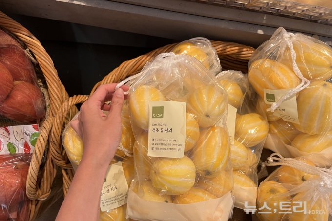 과일 코너에 진열돼 있는 '저탄소 농산물' 앞에는 생산과정부터 에너지와 농자재 사용을 줄여 온실가스 배출을 줄이고 지구환경을 지킨 농산물이라는 친절(?)한 설명도 있었다. '100% 당도선별 성주 꿀 참외' 제품들은 저탄소 인증마크도 붙어있었다. 지구환경까지 생각했다는 설명과 함께. 하지만 '지구환경을 지킨다'는 이런 설명이 무색할만큼 참외 포장재는 모두 비닐이었다. 심지어 비닐 포장에 나일론 끈까지 달려있었다.