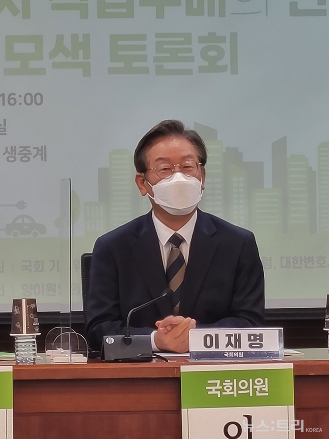 이재명 의원은 17일 국회 의원회관에서 열린 'RE100 실행, 재생에너지 직접구매의 난관과 해결방안 모색 토론회'에 축사에서 이같이 언급한뒤 "기후위기는 피할 수 없는 문제기 때문에 재생에너지로 신속하게 전환하는 등의 선제적 전략이 필요하다"고 강조했다.