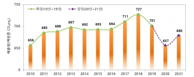 28일 환경부 온실가스종합정보센터가 공개한 '2021년 국가 온실가스 잠정배출량'에 따르면 지난해 우리나라 온실가스 배출량 잠정치는 6억7960만톤이다. 2020년 배출량 6억5660만톤보다 2300만톤이나 늘어난 것이다.