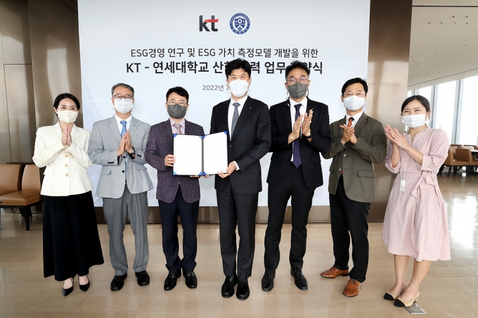 KT는 ESG 가치 측정 모델 개발을 위해 연세대 ESG·기업윤리 연구센터와 업무협약을 맺고 관련 공동 연구를 추진한다고 7일 밝혔다.