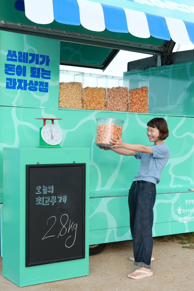 참여자들은 씨낵 트럭에서 청소 도구를 받아 해수욕장에서 쓰레기를 수거해오면 무게에 따라 과자로 교환받을 수 있다.