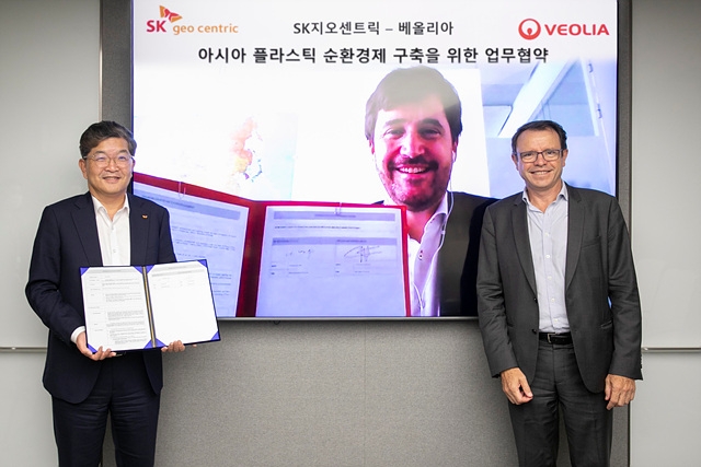 SK지오센트릭과 베올리아아시아는 서울시 종로구 SK그린캠퍼스에서 열린 화상회의에서 아시아 시장 내 순환경제 사업활성화를 위한 양해각서(MOU)를 체결했다고 25일 밝혔다. 플라스틱의 기계적 재활용과 함께 기존에 다른 재활용 방법이 없는 플라스틱에 대한 대체 솔루션을 구현하는 분야에 협력하기로 한 것이다.