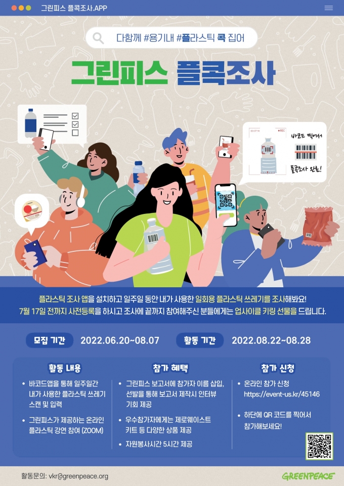 그린피스가 시민들의 플라스틱 사용량을 조사하기 위해 스마트폰 애플리케이션(앱) '플콕'(플라스틱 콕 집어내)을 자체 개발하고 현재 참가자들을 모집하고 있다. 참가자 모집은 8월 7일까지이며, 현재 4000명이 등록한 상태다.