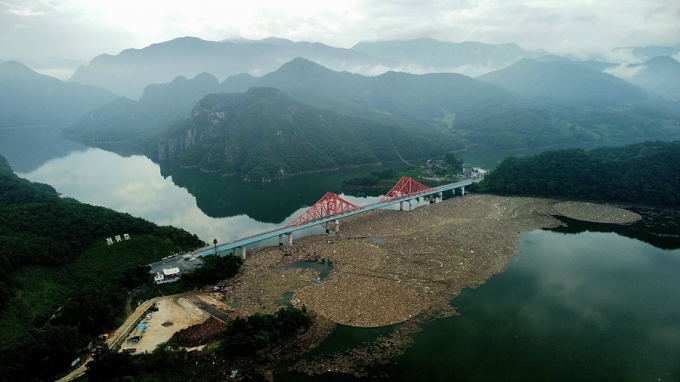 최근 중부지방에 쏟아진 집중호우로 충주호(청풍호)에 부유물들이 뭉친 쓰레기 섬이 형성됐다.