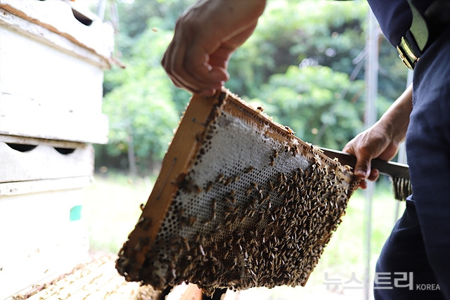 ▲제주시 인근에서 양봉업을 하는 한 양봉업자가 벌집을 들어보이고 있다. ©newstree 조인준 기자