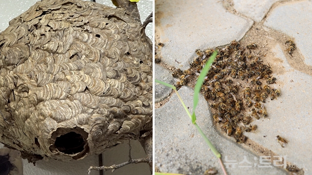 ▲등검은말벌집(왼쪽)과 등검은말벌이 물어죽인 꿀벌들 ©newstree 조인준 기자