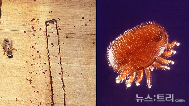 ▲꿀벌에 기생하는 '꿀벌응애'(오른쪽). 바닥에 보이는 갈색 반점(왼쪽)은 방제 후 죽어 떨어진 꿀벌응애들이다.