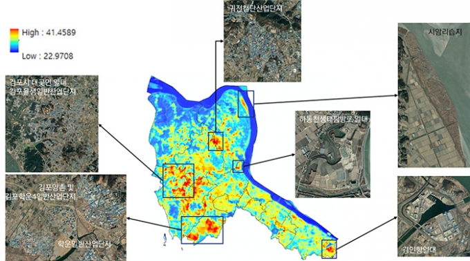 예를 들어 김포시의 경우 산업단지의 지표온도가 주변보다 10도 이상 높은 것으로 나타났다. 율생일반산업단지, 학운일반산업단지, 귀전첨단산업단지 등은 빨간색으로 나오는데, 주변 산림은 노란색이나 파란색으로 나온다. 최근 김포시는 지표온도지도를 활용하여 지표온도가 높은 지역에 무더위쉼터를 확대하고 이동형 쉼터를 운영하는 한편, 취약계층이 이용하는 시설에 단열 개선 사업을 벌이는 등 환경보전계획을 세웠다.
