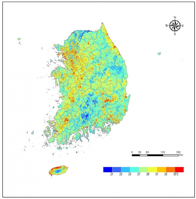 국립환경과학원에서 이번에 공개한 지표온도지도는 기존 제공되던 2016~2018년 3년간의 자료에 2019년과 2020년 자료를 추가로 반영한 것이다. 최근 5년간 미국 랜드샛(Landsat) 8호 위성의 열적외선 관측값을 온도로 변화한 뒤, 30m 해상도의 격자별로 5년 중 가장 높은 온도를 선택해 조합하는 방식으로 전국 모든 지자체를 대상으로 시군별로 작성됐다.