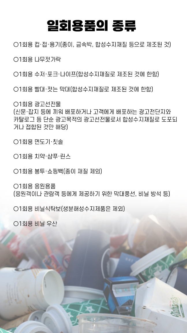 당초 사용이 규제됐던 일회용 품목은 일회용 컵·접시·용기, 나무젓가락, 나무 이쑤시개, 플라스틱 수저와 포크, 비닐봉투, 응원용 막대풍선 등이었지만 이번에 종이컵과 플라스틱 빨대, 젓는 막대, 비닐우산, 플라스틱 응원용품 등이 추가됐다.