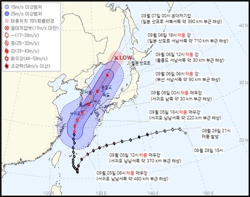 강력한 비바람을 동반한 힌남노는 이날 오전 6시 제주 서귀포시 남남서쪽 480㎞ 해상을 지났다. 곧 북위 30도선을 넘어 정오쯤 서귀포시 남남서쪽 370㎞ 해상에 이른 뒤 우리나라로 방향을 틀 예정이다.