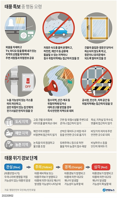 무엇보다 이번 태풍은 강력한 바람과 폭우가 동반된 역대급 괴물태풍이므로 정부는 가급적 외출을 삼가하라고 당부하고 있다. 특히 해안지역에 거주하거나 반지하 등 침수위험 지역에 거주하는 사람들은 안전한 장소로 대피하는 것이 무엇보다 중요하다.