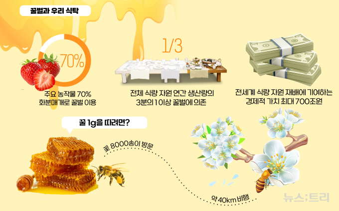 유엔식량농업기구(FAO)에 따르면 해마다 꿀벌은 700조원 규모의 경제적 가치를 창출하고 있다. 특히 과채류 생산에 있어 꿀벌은 없어서는 안 될 가장 유능한 농사꾼이다. 벌꿀 1g을 만들기 위해  꿀벌은 약 8000송이에 달하는 꽃을 오가며 꿀을 모은다. 이렇게 꽃과 꽃 사이를 날아다니면서 꽃가루를 옮긴 덕에 식물은 열매를 맺게 된다. 인류가 먹는 농작물의 70%가 이런 꿀벌의 꿀 채취 활동을 통해 얻어지고 있고, 전체 식량자원의 3분의 1 이상이 꿀벌에 직·간접적으로 의존하고 있다. 그래서 영국 왕립지리학회(RGS)는 꿀벌을 '살아있는 가장 중요한 생명체'라고 선언하기도 했다.
