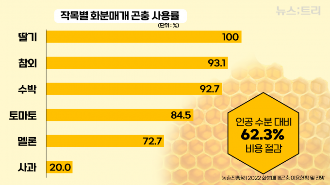이 박사는 "딸기의 경우 사람이 직접 수분하면 꿀벌에 비해 중량이 절반 이상 줄어들고, 기형과율은 85~100%로 높아진다"면서 "꿀벌을 통한 수분이 착과율이 높고, 기형과가 생겨날 확률이 낮아 생산성과 품질면에서 훨씬 뛰어나다"고 말했다. 그러면서 "꿀벌 부족현상은 장차 농가소득에도 악영향을 미칠 가능성이 높다"고 내다봤다.