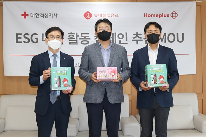 롯데칠성음료와 홈플러스, 대한적십자사는 이웃사랑 실천과 나눔문화 확산을 위한 '나눔 캠페인'을 함께 전개하기로 하고 15일 업무협약을 체결했다.