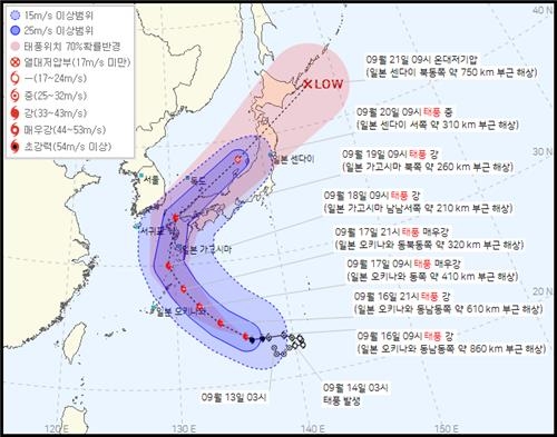 기상청은 16일 "태풍 난마돌이 오전 9시 현재 일본 오키나와 동남동쪽 약 860㎞ 부근 해상에서 시속 12㎞ 속도로 북서진하고 있다"고 밝혔다. 중심기압은 955h㎩(헥토파스칼), 중심 최대풍속은 40㎧, 강풍반경은 380㎞로 '강' 등급 태풍이다. 기상청은 난마돌이 고수온역을 지나면서 세력을 키워 오키나와 동쪽 약 410㎞ 부근 해상에 이르는 17일 오전 9시에 '매우 강' 등급이 될 것으로 예측했다.
