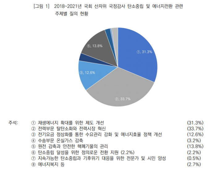 에너지전환포럼은 27일 최근 4년(2018~2021년)간 국회 산업통상자원중소벤처위원회(이하 산자위) 에너지부문 국정감사 질의를 전수조사한 결과 '전력부문 탈탄소화'와 '전력시장 혁신'에 대한 질의가 139건(33.7%)으로 가장 많았다. 다음으로 '재생에너지 확대를 위한 제도 개선'이 129건(31.3%), '원전 감축과 안전한 핵폐기물 관리'가 57건(13.8%) 순이었다.