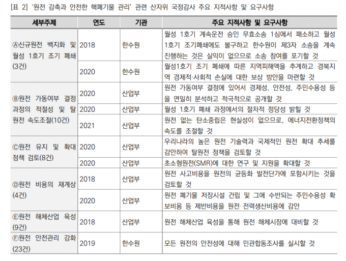 정당간 입장차가 가장 극명하게 갈리는 이슈는 '원전 감축과 안전한 핵폐기물의 관리' 관련 질의였다. 특히 국민의힘 의원들은 탈원전 속도 조절이 필요하며, 현재보다 원전을 확대해야 한다는 지적이 주를 이룬 것으로 나타났다. 국민의힘 의원들은 한국수력원자력에 정부의 탈원전 정책에 대한 입장을 밝히라거나, 외압성 여부, 원전 감축 속도 조절의 필요성 등에 대해 집요하게 질의했던 것으로 나타났다.