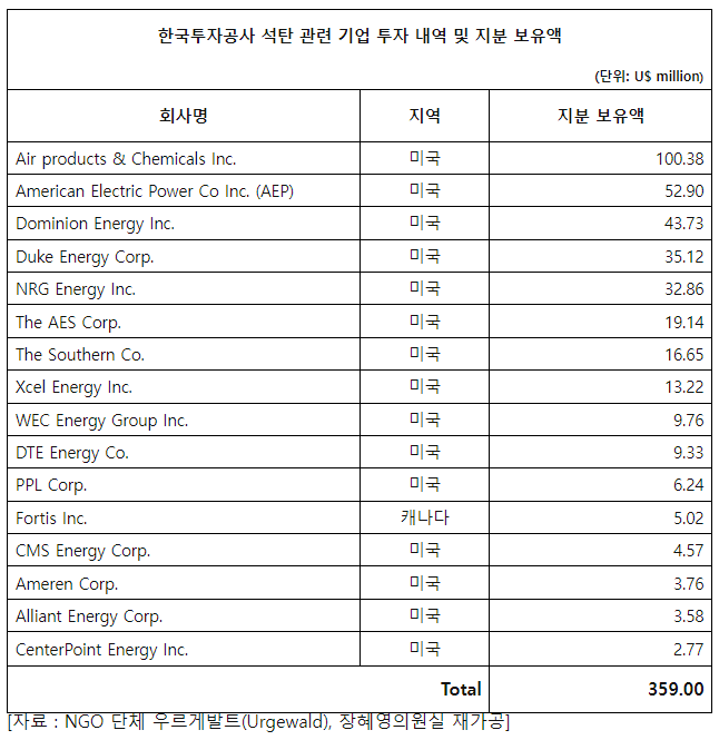 19일 정의당 장혜영 의원(기획재정위원회)은 KIC가 미국증권거래위원회(SEC)에 제출한 보고서를 입수해 공개했다. 보고서에 따르면 KIC는 산업용 가스를 판매하는 미국의 에어프로덕츠 앤드 케미컬즈를 비롯해 해외 석탄 관련 16개 기업에 총 3억5900만달러(약 5000억원 이상)를 투자하고 있는 것으로 확인됐다.