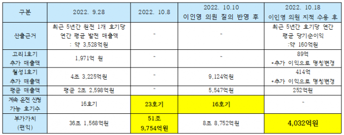 당초 원안위는 평균 매출액 2조2598억원에 계속 운전 신청가능 원전 16개를 곱하여 36조1568억원의 편익을 계산했고, 23호기까지 그 수를 늘려 51조 9754억원까지 계산했다. 하지만 이인영 의원 질의 후 평균 매출액이 5547억원으로 정정됐고, 원전 수도 23개에서 16개로 다시 수정돼 8조8752억원으로 정정했다.