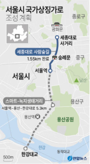 광화문에서 서울역까지 1.55km 구간에 '세종대로 사람숲길' 조성을 완료한 서울시가 올해부터 서울역에서 한강으로 이어지는 5.3km 구간에 '국가상징가로' 조성사업을 시작한다. 오는 2025년 12월 완공을 목표로 진행되는 이 사업이 완성되면 파리의 '샹젤리제 거리'처럼 광화문에서 한강까지 7km 구간이 녹지생태 거리로 탈바꿈하게 된다.