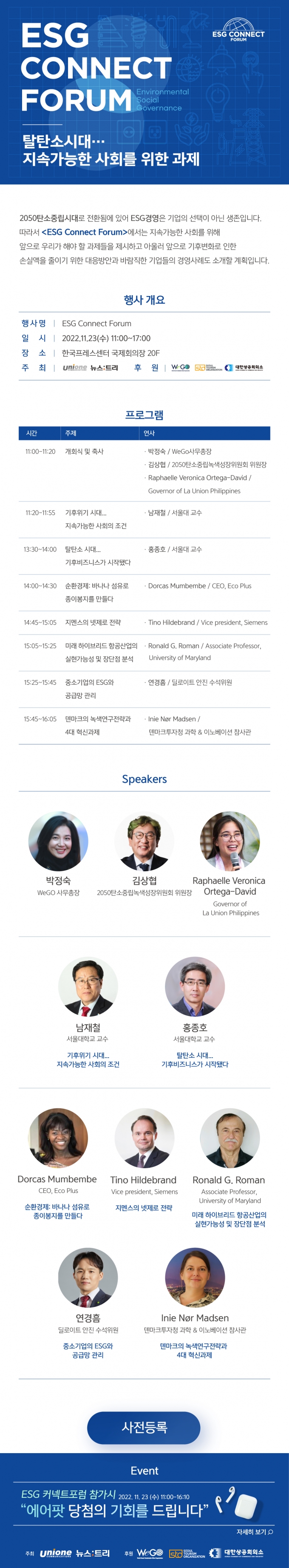 뉴스트리는 유니원커뮤니케이션즈와 함께 오는 11월 23일 오전 11시 서울 프레스센터 20층 국제회의실에서 세계스마트시티국제기구(WeGO)와 서울관광재단, 대한상공회의소 후원으로 '탈탄소 시대, 지속가능한 사회를 위한 과제'를 주제로 세번째 ESG커넥트포럼을 개최합니다.