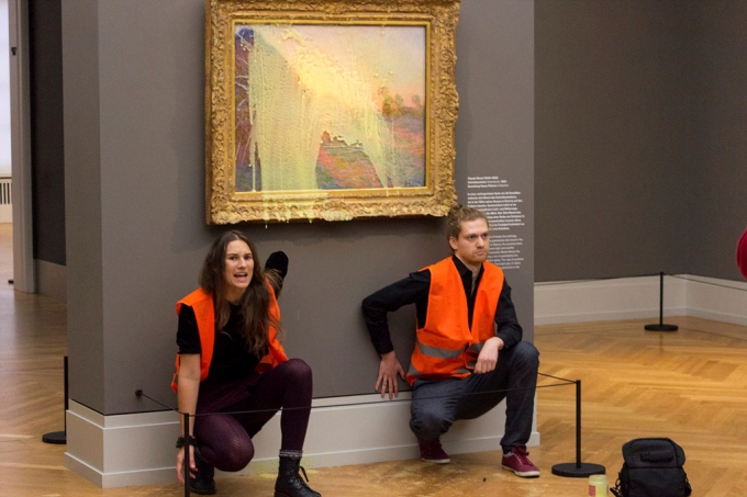 최근 기후위기에 대한 대중의 관심을 유도하기 위해 비슷한 유형의 '과격 시위'가 연달아 일어나고 있다. 지난달 기후운동가들은 영국 런던국립미술관에서 반 고흐의 1888년 유화 '해바라기'에 하인즈 캔 수프를 끼얹고, 미술관 벽에 자신의 손을 접착제로 붙이는 시위를 벌였다. 독일 포츠담 바르베리니미술관에 전시된 프랑스 인상파 화가 클로드 모네의 연작 그림 '건초더미'에는 으깬 감자가 뿌려졌다. 호주 멜버른 빅토리아 국립박물관에 전시된 피카소의 걸작 '한국에서의 학살'에 기후활동가가 접착제를 바른 손을 명화 위에 붙이기도 했다.
