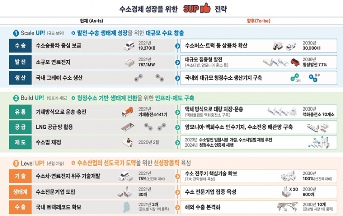 수요창출 방안으로 2030년까지 수소상용차 3만대를 보급하고 액화수소충전소 70개소를 개설할 계획이다. 또 2036년까지 청정수소의 발전비중을 7.3%로 높일 방침이다. 이 계획이 실현되면 2030년에 47조1000억원의 경제적 파급효과와 9만8000명의 고용창출 효과를 가져올 것으로 예상했다. 무엇보다 이를 통해 온실가스 2800만톤을 감축할 수 있을 것으로 기대하고 있다.