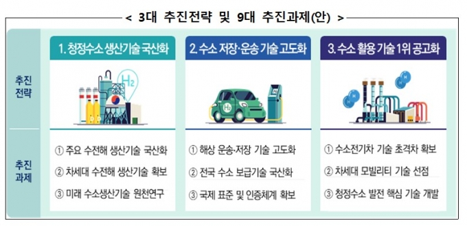 과학기술정보통신부는 '수소기술 미래전략'을 수립했다. 이 전략은 △청정수소 생산기술 국산화 △수소 공급을 위한 저장‧운송 기술 고도화 △수소 활용 기술 초격차 확보 등 3대 추진전략을 바탕으로 9개 과제를 추진한다. 이를 통해 현재 60%에 불과한 수전해 기술 국산화율을 2030년 100%까지 높이겠다는 방침이다. 국산화를 추진하는 분야는 △주요 수전해 생산기술 △차세대 수전해 생산기술 확보 △미래 수소생산기술 원천연구 분야다.