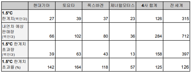 지구 온도상승이 산업화 이전대비 1.5°C 이내로 제한하려면 2040년까지 전세계 시장에서 내연차 판매량이 3억1500만대 이내여야 하는데, 글로벌 완성차 4곳의 내연차 판매량만 추산해도 이 기준보다 4억대를 훌쩍 넘어선다는 지적이다. 현대기아차와 토요타, 폭스바겐, 제너럴모터스의 점유율을 합치면 전세계 자동차 시장의 40%에 이른다.