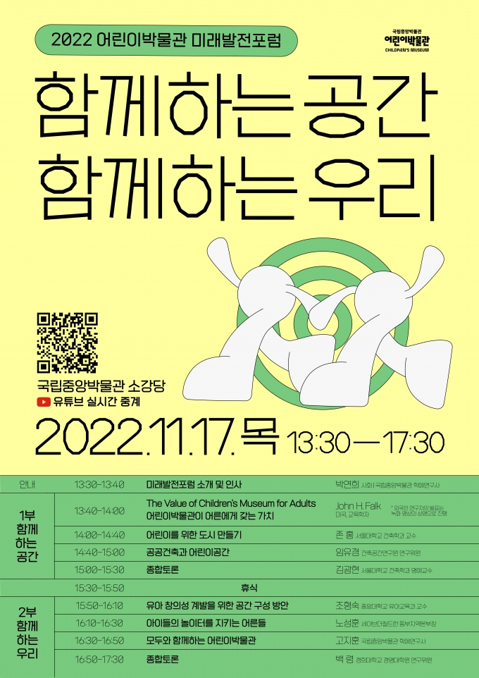 국립중앙박물관은 "전문가와 일반인 등 누구나 접속·참여할 수 있는 이번 포럼을 통해 어린이와 함께하는 미래지향적인 공간에 대해 다각도로 고민하고 성찰하는 뜻깊은 시간이 될 것으로 기대한다"고 밝혔다.