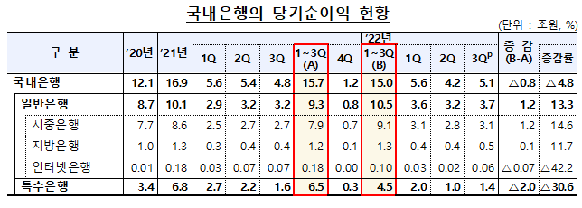 18일 금융감독원은 2022년 3분기 기준 국내은행 영업실적(잠정)을 공개했다. 2022년 1~3분기 기준 국내은행 당기순이익은 15조원으로 전년 동기 대비 8000억원 감소했다.
