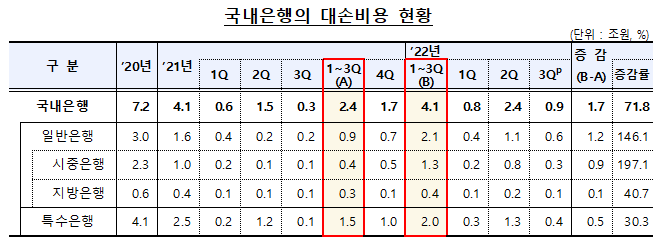 대출채권 등 은행의 운용자산이 계속 늘어나면서 이자이익도 함께 늘었지만, 금리가 오르면서 유가증권 평가·매매손실 등으로 비이자이익이 감소했고, 대내·외 경제여건이 악화되면서 떼일 가능성이 높은 돈을 떼인 것으로 잠정 결정하는 '대손충당금'으로 인한 비용이 늘면서 전체 이익이 감소했다는 게 금감원의 설명이다.