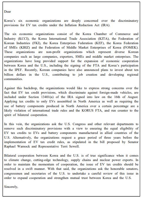 18일 경제 6단체는 IRA이 한국산 전기차에 대한 차별적 조항을 포함하고 있는 문제를 해결해달라는 요청을 담은 서한을 송부했다고 밝혔다.