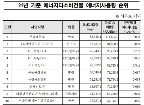 다음으로 온실가스 배출량이 많은 건물은 인터넷데이터센터(IDC)와 연구소였다. △KT목동인터넷데이터센터·IDC(9만5423톤) △KT목동IDC2(8만8378톤) △LG사이언스파크(8만4960톤) △LG가상IDC(8만4715톤) 순이다.