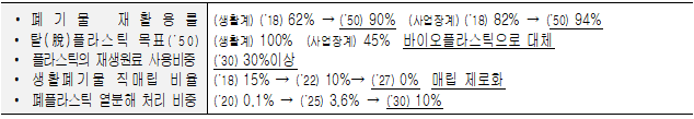 '순환경제'란 자원의 절약과 재활용 등을 통해 자원의 이용 가치를 극대화하는 친환경 경제모델이다. 유엔 지속가능발전목표, 세계경제포럼 등에서 환경문제 해결을 위한 새로운 대안으로 부상하고 있다. 정부는 2050년 탄소중립 이행을 위한 순환경제 구축을 위해 '폐기물 재활용률 90%이상'을 목표로 수립하고, '탈플라스틱'(2050년), '플라스틱 재생원료 사용 의무화'(2030년 30%), '생활폐기물 직매립 제로화'(2027년) 등을 세부 목표로 설정했다.