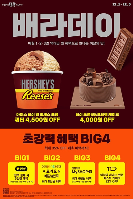 12월 1, 2, 3일 총 3일간 진행되는 '배라데이'는 12월 이달의 맛 '아이스 허쉬 앤 리세스'를 대상으로 다양한 혜택을 제공한다. 신제품 '아이스 허쉬 앤 리세스'는 글로벌 초콜릿 브랜드 '허쉬(HERSHEY'S)', 허쉬의 피넛버터 브랜드 '리세스(REESE'S)'와 협업해 탄생한 제품으로 겨울 시즌에 어울리는 깊고 진한 달콤함을 선사한다.
