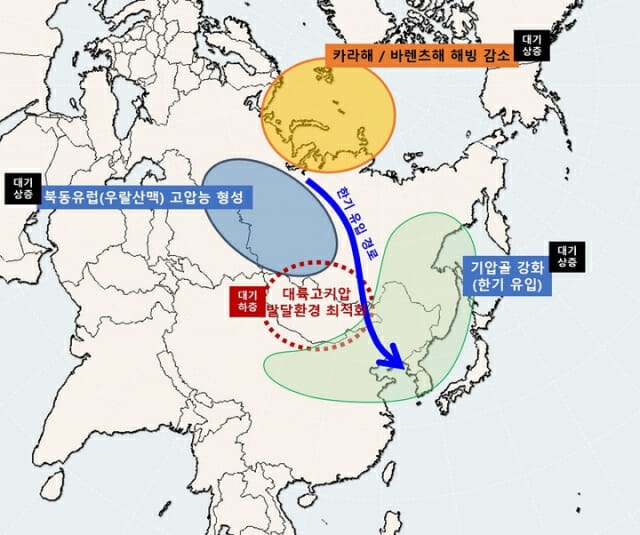 그 결과 북쪽의 찬 공기가 우리나라 방향으로 내려보내는 길이 만들어지고, 찬 공기가 한반도로 곧장 유입된다.