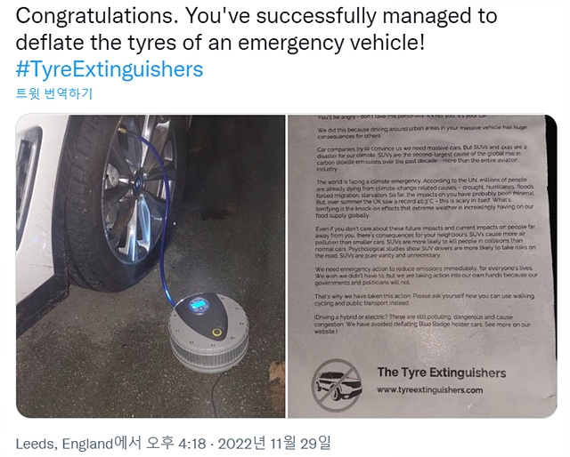 29일(현지시간) 영국 가디언지에 따르면, 게릴라 기후 운동 단체 '타이어 없애는 사람들'이 밤사이 유럽과 미국의 8개 도시의 SUV 약 900대의 바퀴 바람을 뺀 것으로 알려졌다.