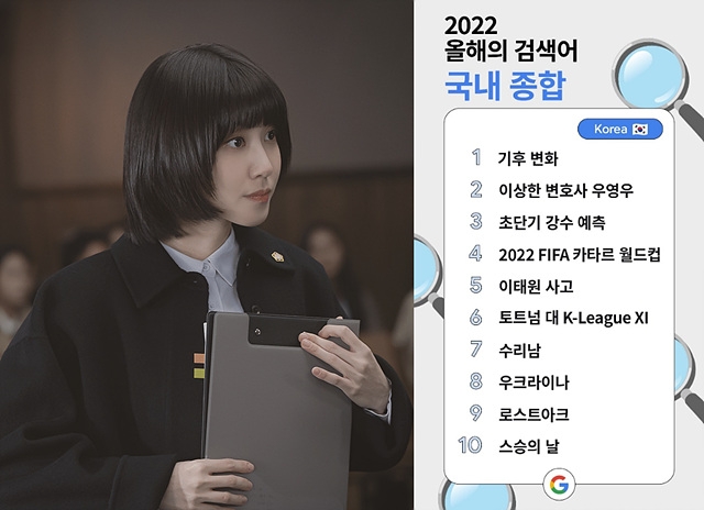 또한 구글은 '이상한 변호사 우영우'와 '수리남'이 각각 2위와 7위에 오른 것은 K-콘텐츠가 국민들의 관심을 사로잡은 결과라고 파악했다. '2022 FIFA 카타르 월드컵'과 '토트넘 대 K-League XI' 경기가 각각 4위와 6위에 안착한 것은 한국 축구에 대한 전국민적인 열정에 기반한 것으로 봤다.