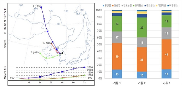 특히 베이징과 톈진 등 중국 대도시가 자리한 산둥지역을 거치는 바람이 춘천에 들어올 때 춘천 초미세먼지 가운데 질산염 비율이 큰 폭으로 높아졌다. 중국 대도시에서 발생한 초미세먼지 전구물질이 우리나라 수도권에서 초미세먼지로 바뀐 뒤 춘천에 유입된 것으로 추정됐다.
