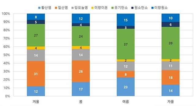이번 관측 결과에 따르면, 춘천지역 초미세먼지 평균농도는 18㎍/㎥으로 같은 기간 전국 평균 농도 수준지만 성분 구성비는 다른 지역과 달리 유기탄소의 비율이 가장 높았다. 이 지역의 유기탄소 비중은 29%로 가장 높았고, 질산염 26%, 황산염 15%, 암모늄염 14% 순으로 나타났다. 겨울과 봄철은 질산염이 각각 31%, 26% 수준으로 높게 차지했고, 여름과 가을에는 유기탄소 비중이 각각 37%, 39%로 나타났다.