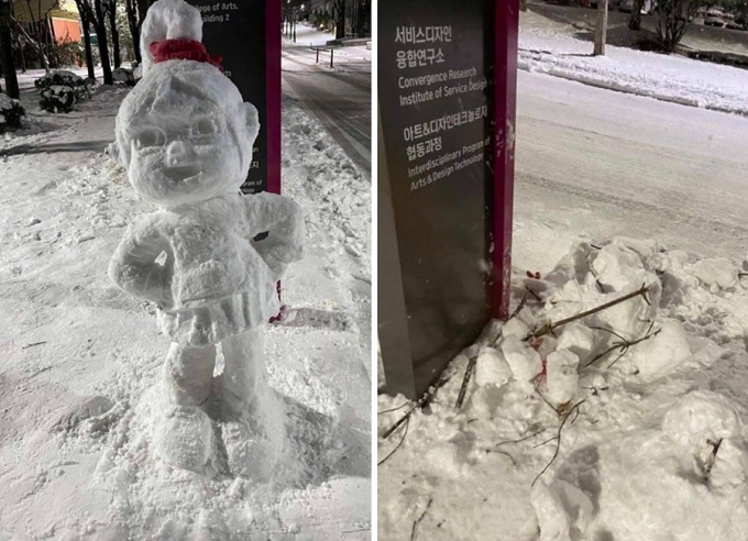 지난 19일부터 여러 온라인 커뮤니티에서 공유되기 시작한 '예대 눈사람 근황'이라는 글이 누리꾼들의 시선을 끌었다. 자신을 '미대생'이라고 소개한 글 작성자는 "오후 8시 30분부터 새벽 3시 30분까지 여러 명이 눈사람을 만들었는데 부수지 말라는 팻말을 만들러 간 사이에 누군가 망가뜨렸다"는 내용과 함께 사진 4장을 올렸다.