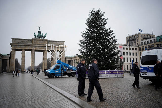 21일(현지시간) 기후운동단체 '마지막 세대' 소속 기후활동가들이 독일 수도 베를린의 브란덴부르크 문 앞에 설치된 대형 크리스마스트리의 꼭대기 부분을 기습적으로 베어냈다.