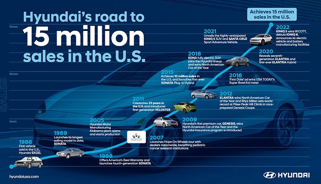 현대자동차는 1986년 1월 울산공장에서 생산한 소형세단 '엑셀'로 미국 시장의 문을 두드린지 20년만인 2005년 미국 남부 앨라배마주에 첫 현지 생산공장을 완공했다. 앨라배마 공장을 발판삼아 현대차는 2007년에 미국 누적판매 500만대를 달성했고, 2015년에는 누적판매 1000만대를 넘어섰다. 그로부터 7년 뒤인 2022년 12월 누적판매 1500만대라는 성과를 거뒀다.