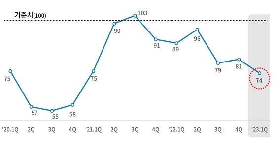 대한상공회의소는 최근 전국 2254개 제조기업을 대상으로 '기업경기전망지수'(BSI:Business Survey Index)를 조사한 결과, 기업들의 2023년 1분기 전망치는 직전분기 대비 7포인트(p), 전년동기 대비 15p 하락한 '74'로 집계됐다고 28일 밝혔다. 이는 코로나 팬데믹의 영향이 컸던 2021년 1분기 BSI인 75와 유사한 수준이다. 당시는 코로나 충격에서 회복되는 추세였지만, 지금은 하락세가 더 뚜렷해지는 양상이다.
