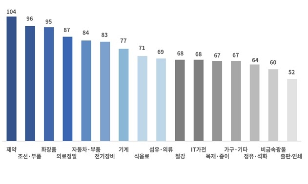 업종별로는 코로나 특수가 지속되고 있는 제약(104)을 제외한 모든 업종에서 경기전망지수가 100을 넘지 못했다. 원자재 의존도가 높은 비금속광물(60), 정유·석화(64) 업종은 특히 부진했다. 높은 원자재가격과 유가 변동성에 고환율이 더해져 제조원가 부담이 커지고 주요국 수요는 둔화된 탓으로 보인다.