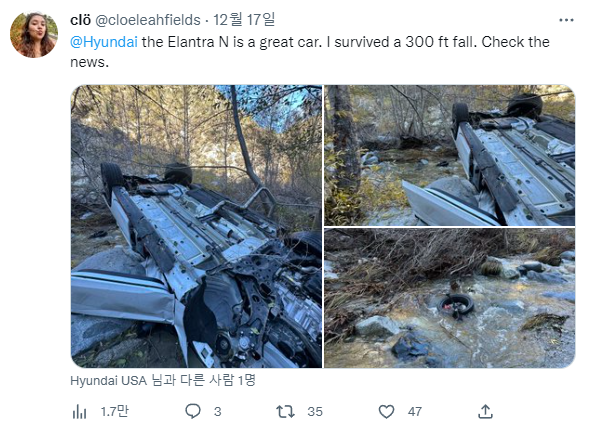 이어 "현대 엘란트라N은 정말 훌륭하다"며 "300피트 아래 떨어져서도 나는 살아남았다"고 전했다.