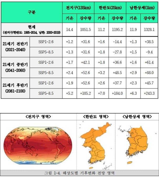 한반도 역시 기후변화로 인해 21세기 후반 평균기온이 2.6~7℃까지 오르며, 강수량은 3~15% 증가할 것으로 전망됐다. 특히 남한의 기후는 2.3~6.3℃ 상승하고, 강수량은 3~18% 증가할 것으로 전망되고 있다.